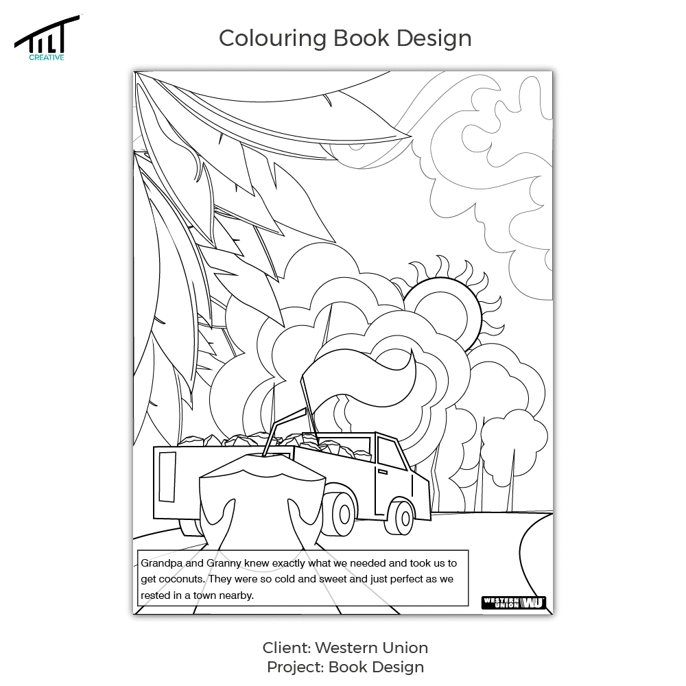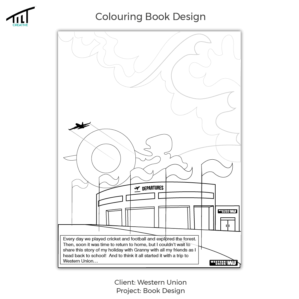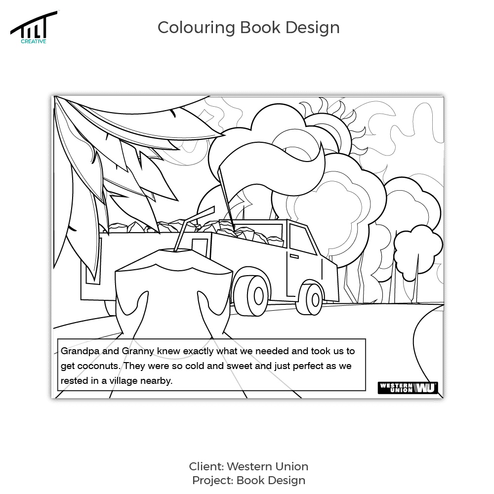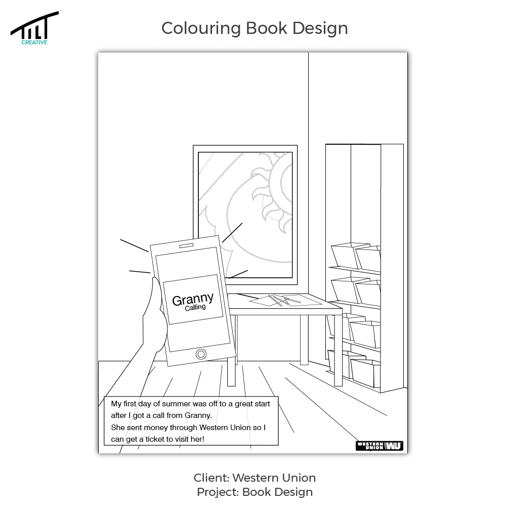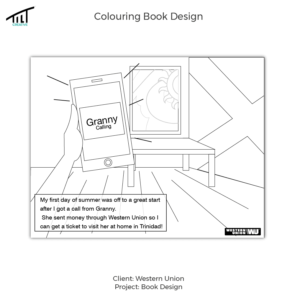 After some brainstorming, we decided to develop a colouring book for the back to school period which was right around the corner. The storyline connects a young girl to her grandmother via Western Union, making the brand relevant and important as the connecting factor at the beginning and end of the story.