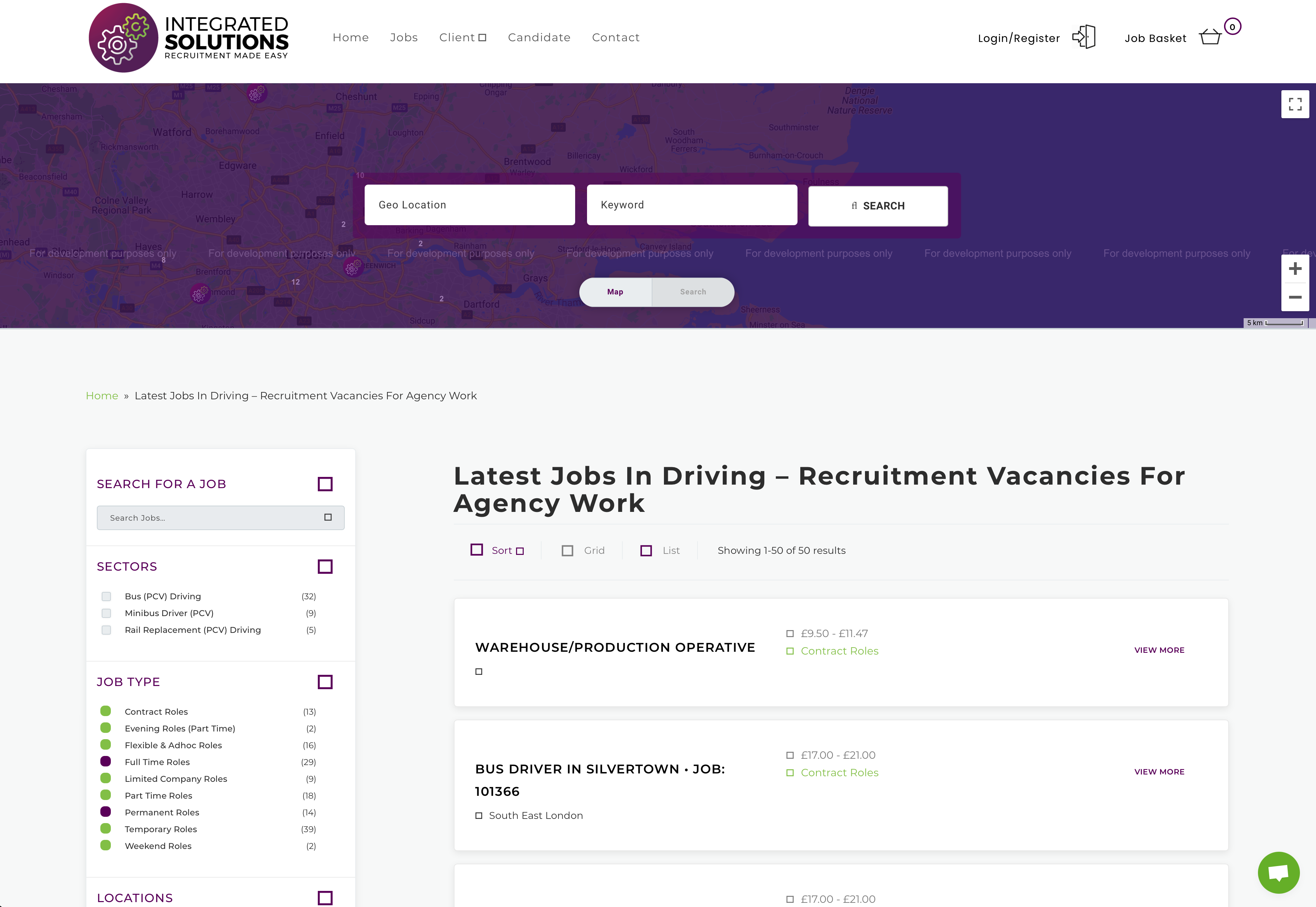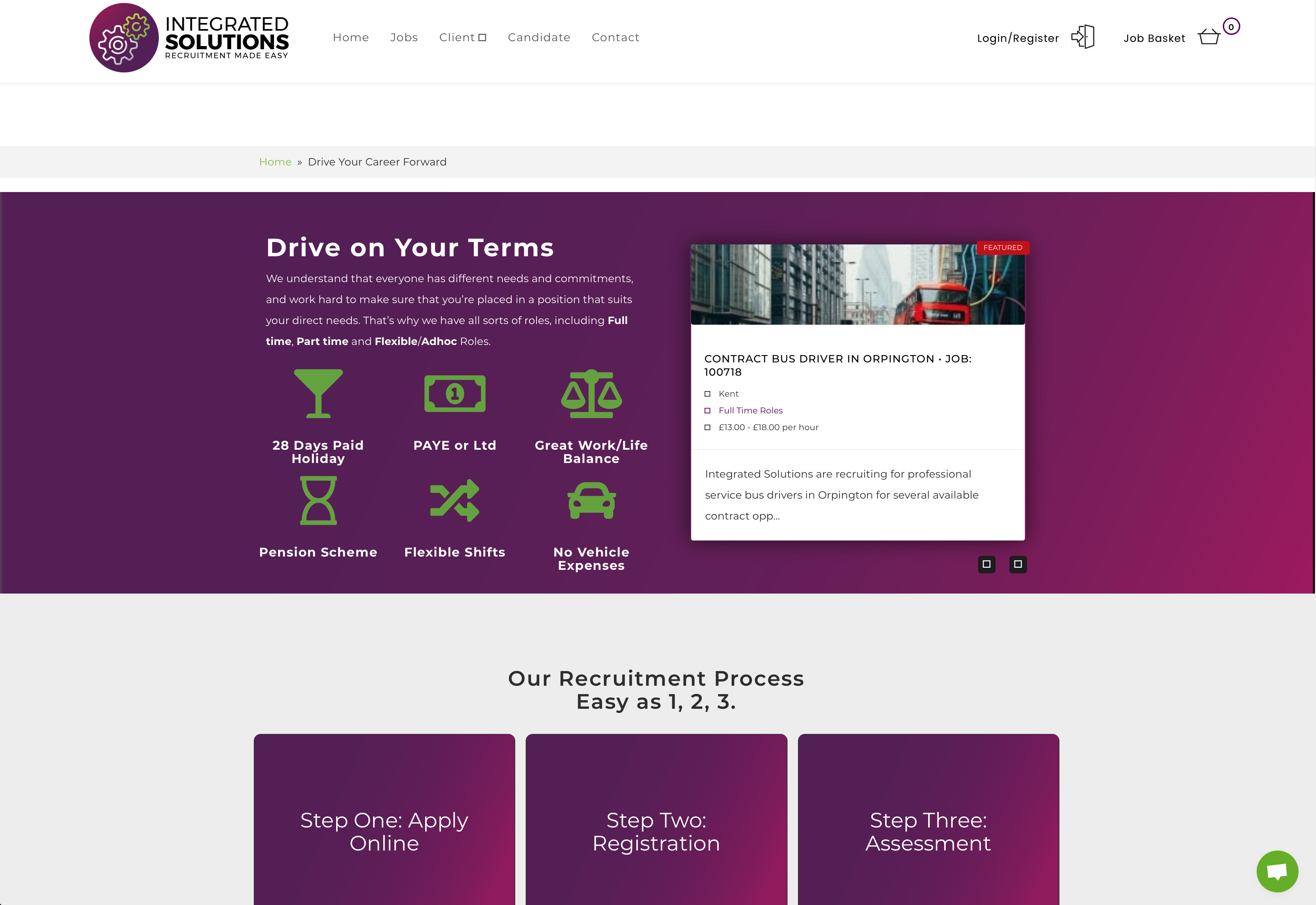Integrated Solutions services two distinct markets: Clients and Candidates. As such the website needed to be split into two distinct experiences, for clients and candidates. A job board was also installed with the intention for the company to move away from advertising and start building their own brand as a job board in and of itself.